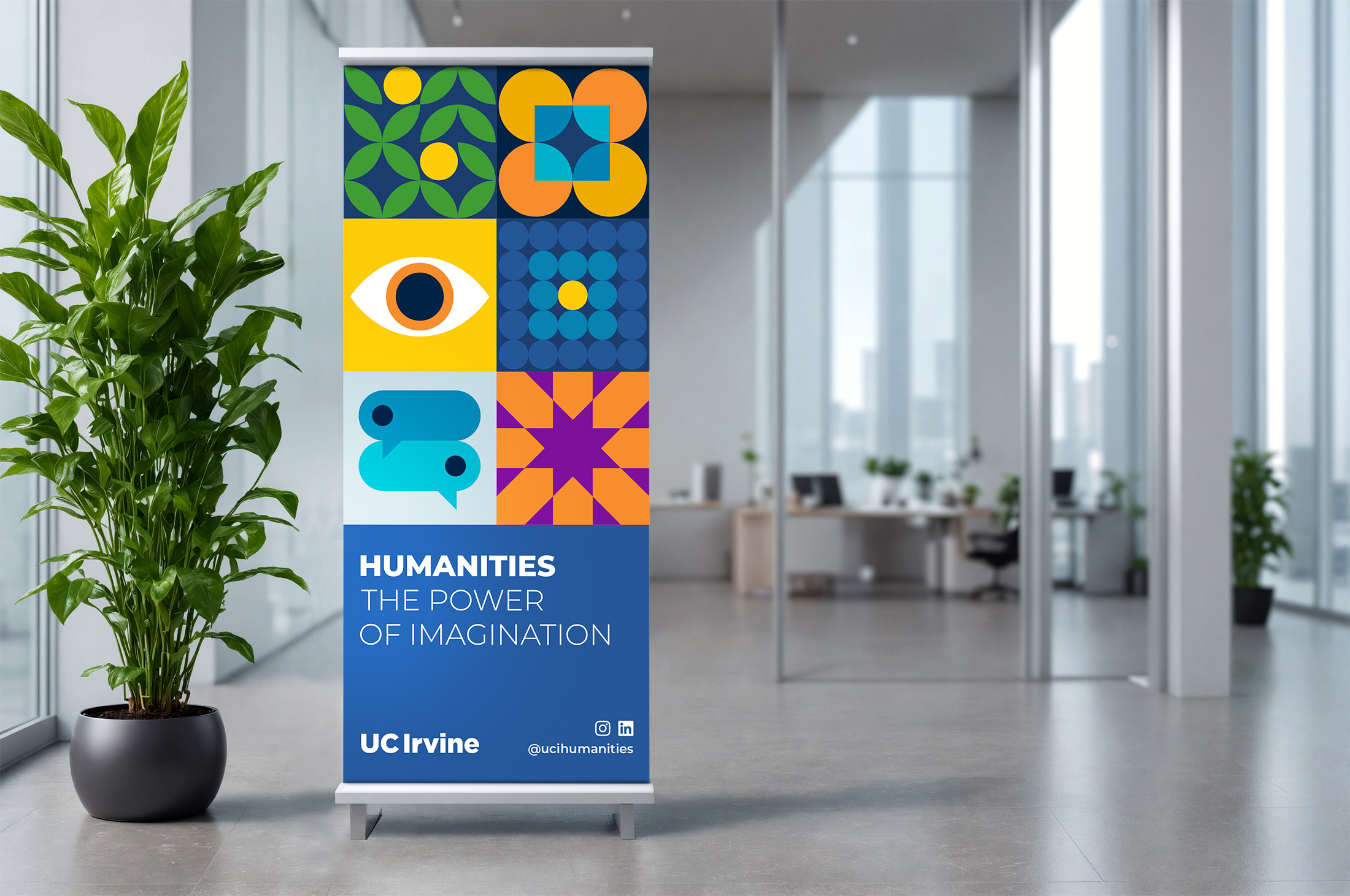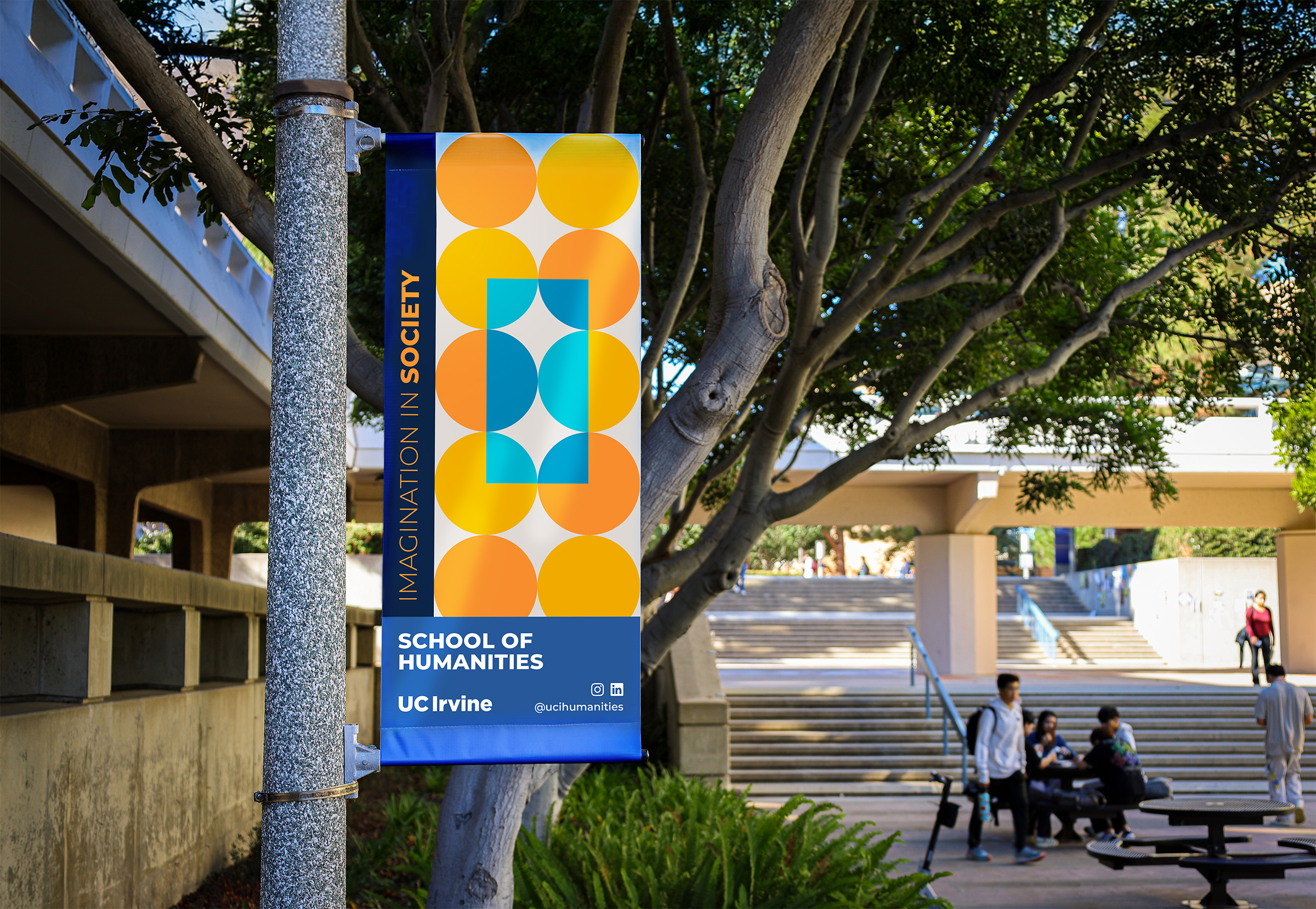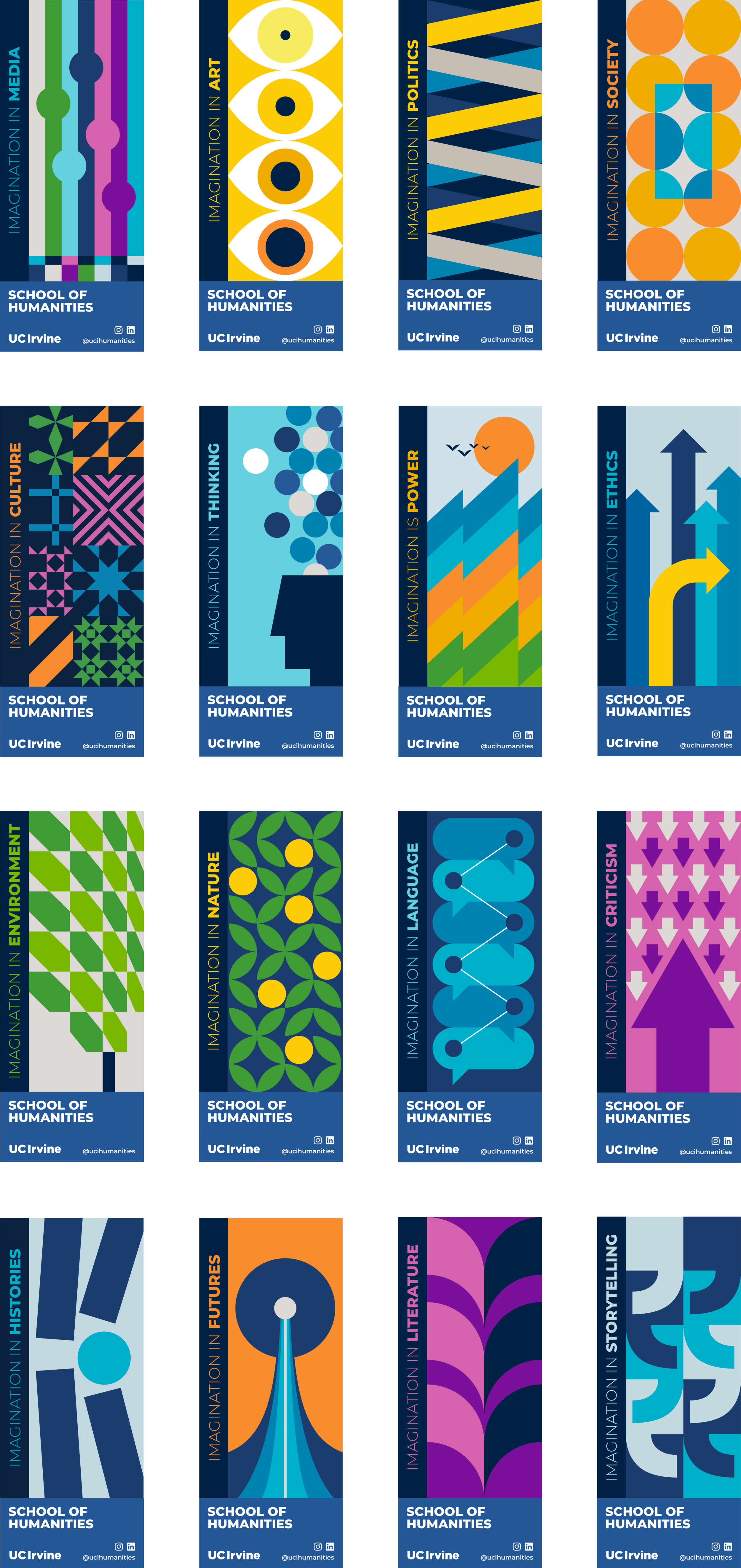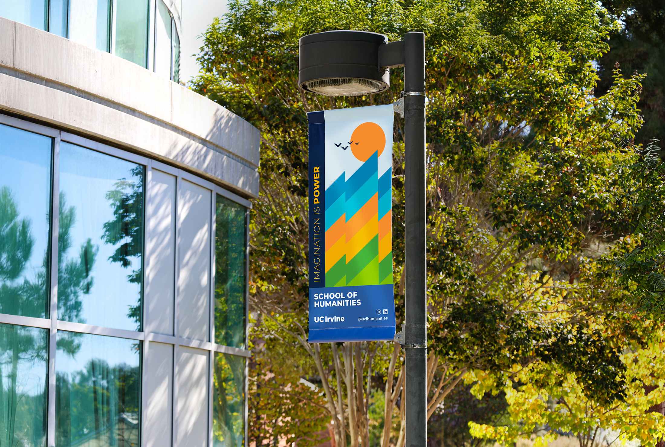 UC Irvine School of Humanities wanted something artful and unique for their 2024/2025 campus banner campaign that differentiated them from all the other schools. Using an “Imagination in _” device we designed 16 vertical banners each with their own topic and modernist illustration representing various Humanities studies and wayfinding. Utilizing their updated brand identity and color palette, the visually striking banners help engage and guide both students and visiting parents on campus.