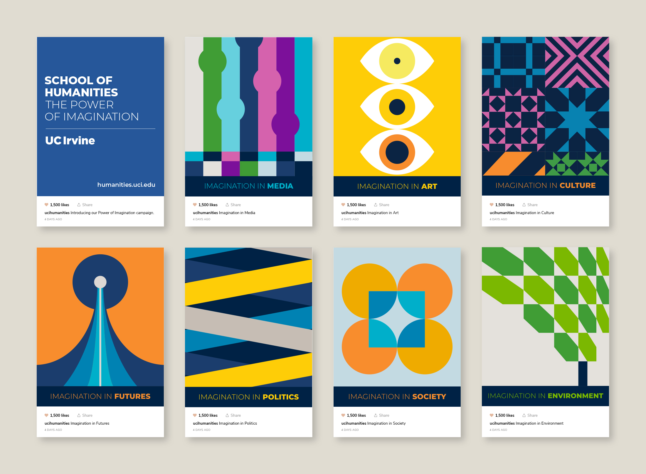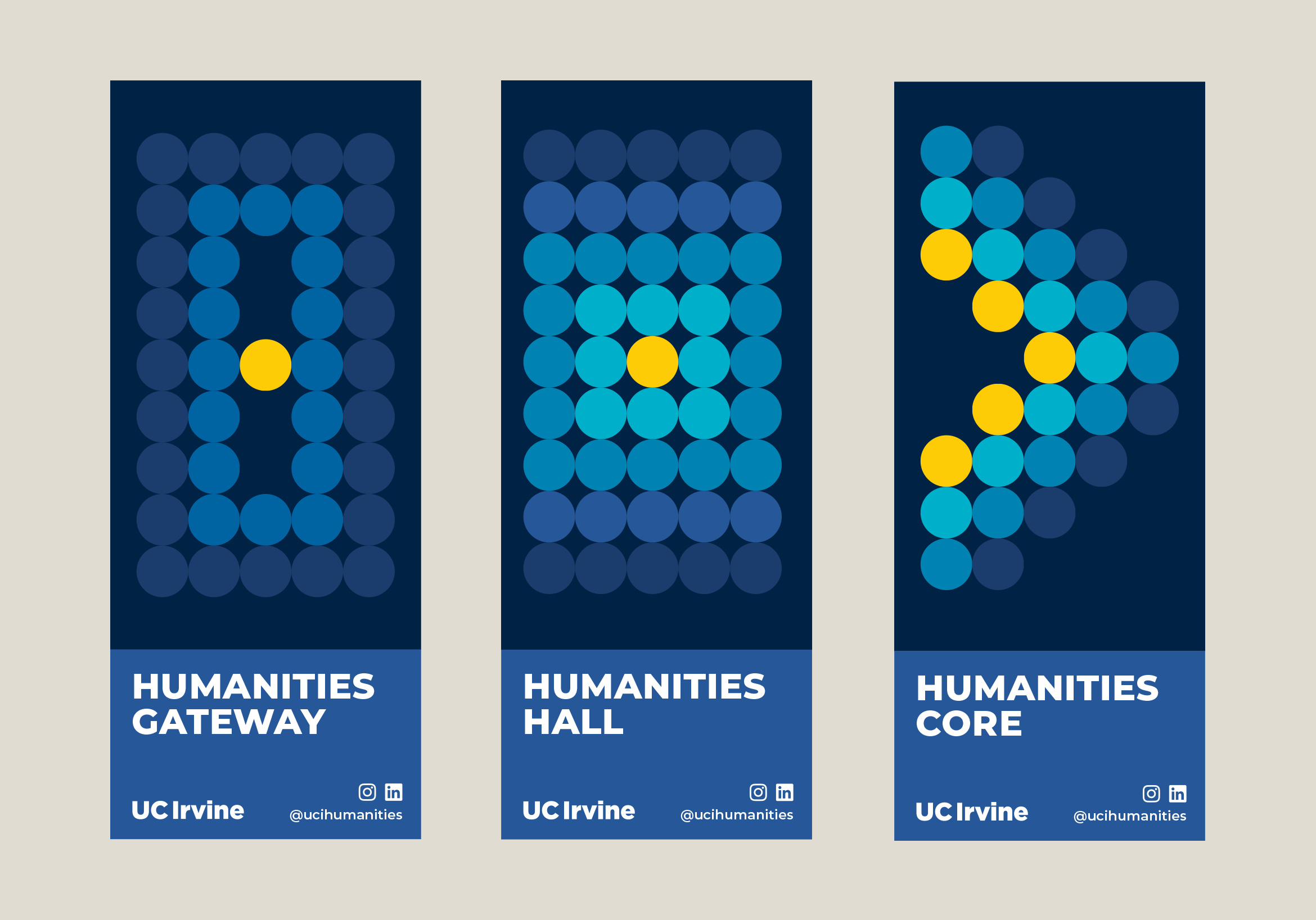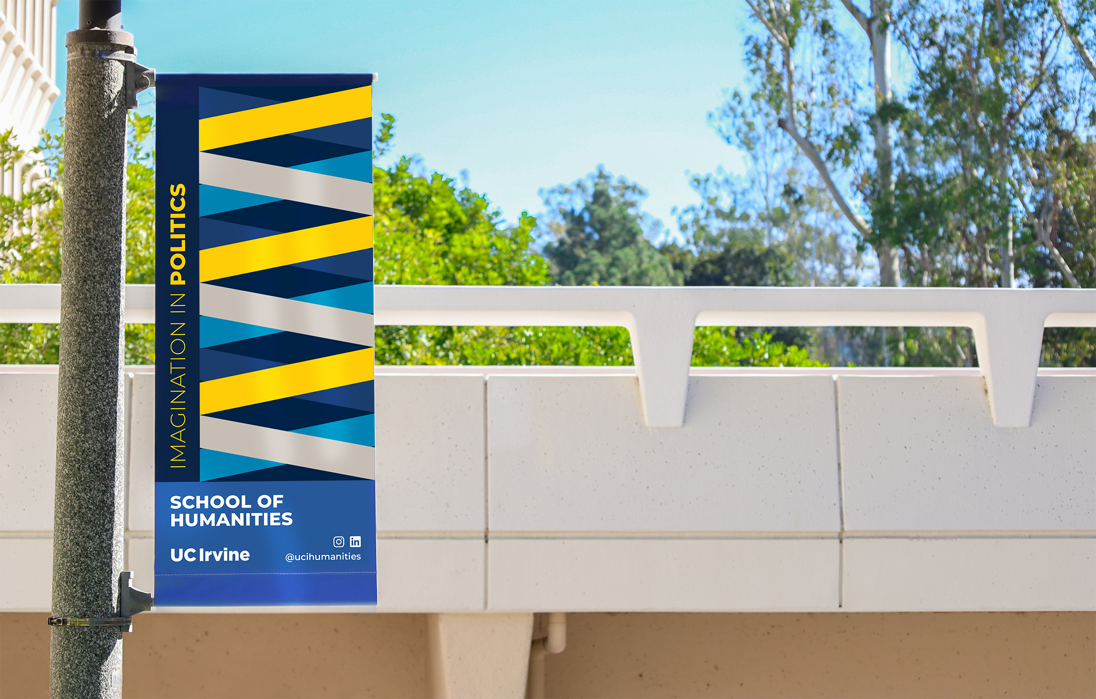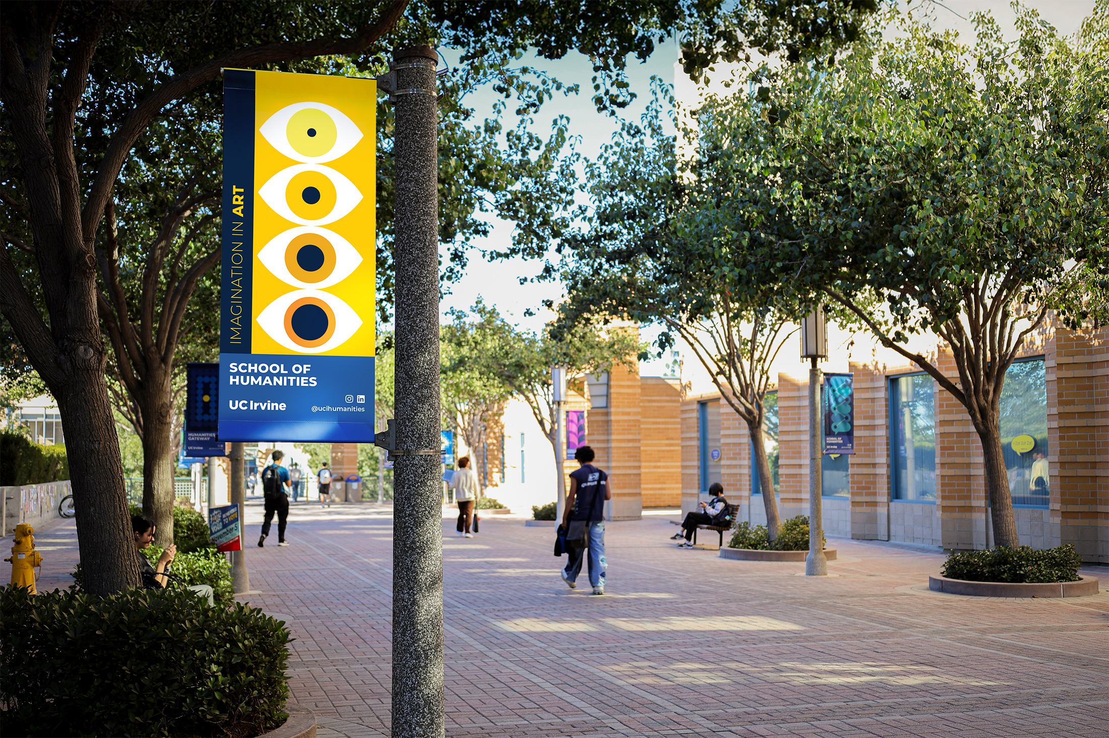 UC Irvine School of Humanities wanted something artful and unique for their 2024/2025 campus banner campaign that differentiated them from all the other schools. Using an “Imagination in _” device we designed 16 vertical banners each with their own topic and modernist illustration representing various Humanities studies and wayfinding. Utilizing their updated brand identity and color palette, the visually striking banners help engage and guide both students and visiting parents on campus.