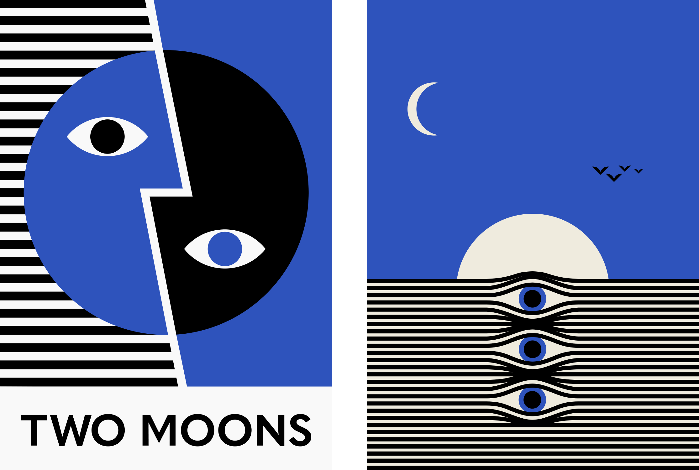 The brand identity features a stylized, modernist mark where two moons become one. Supporting graphics, patterns and fine art prints were also created to compliment the visual look for use on the menus, website and announcements.