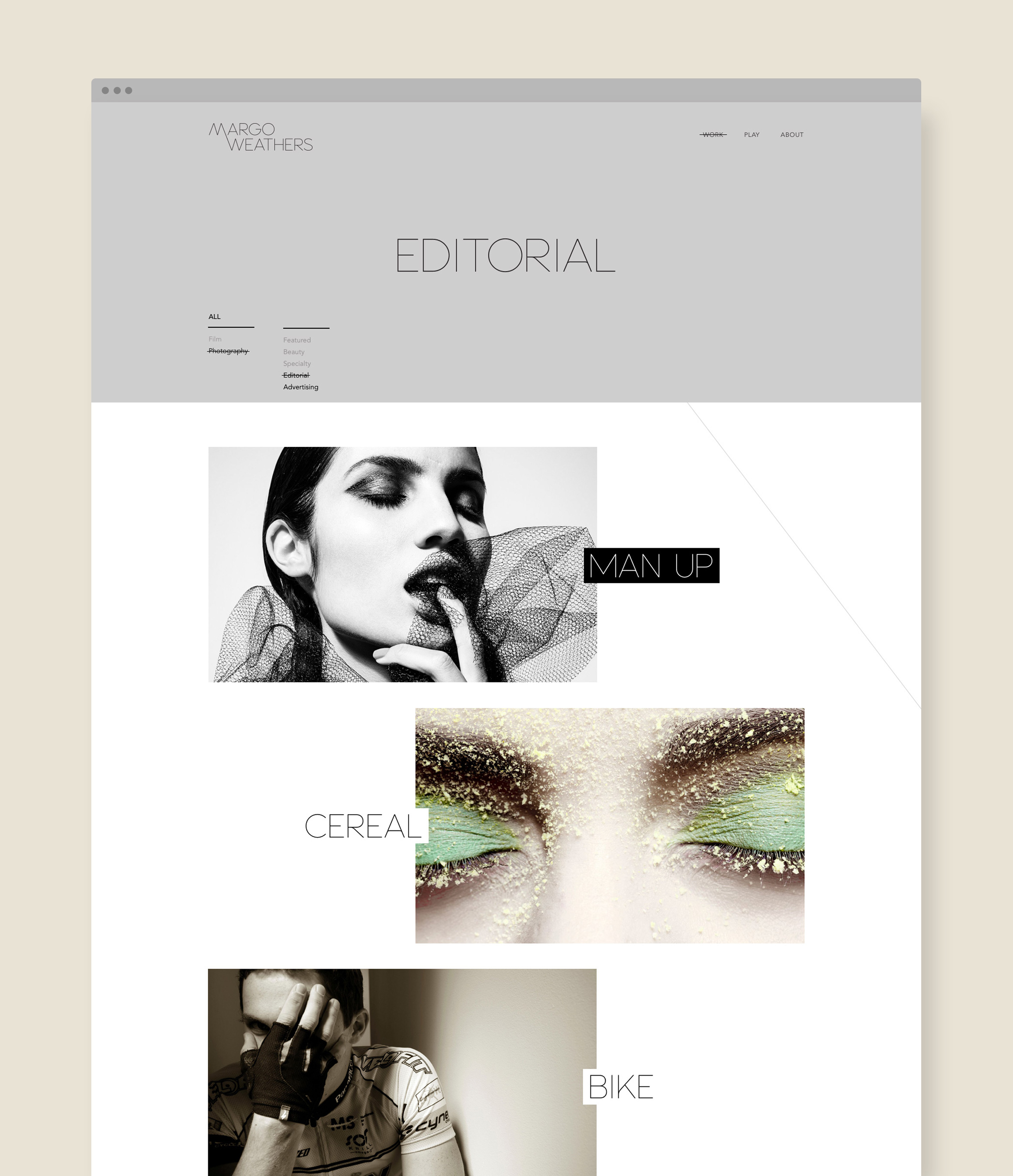 Margo is an LA-based film director and photographer specializing in fashion, beauty and advertising. She wanted a website that showcased her work, and felt as creative, playful and human as her style. A thin, bespoke logotype plays off the similarity of the M and W letterforms.