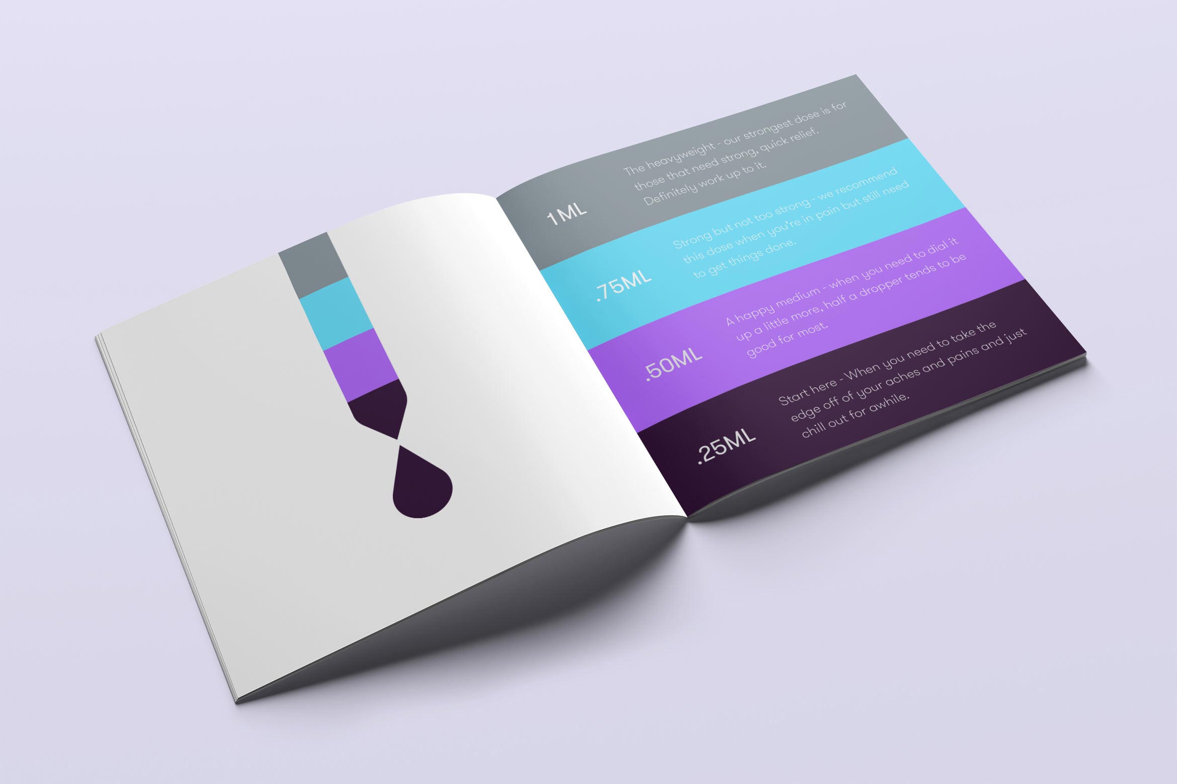 Simple, color-coded brochures were designed to quickly instruct consumers on safe, optimal dosing. The liquid dropper from the mark is used as a motif in the dosing infographic.