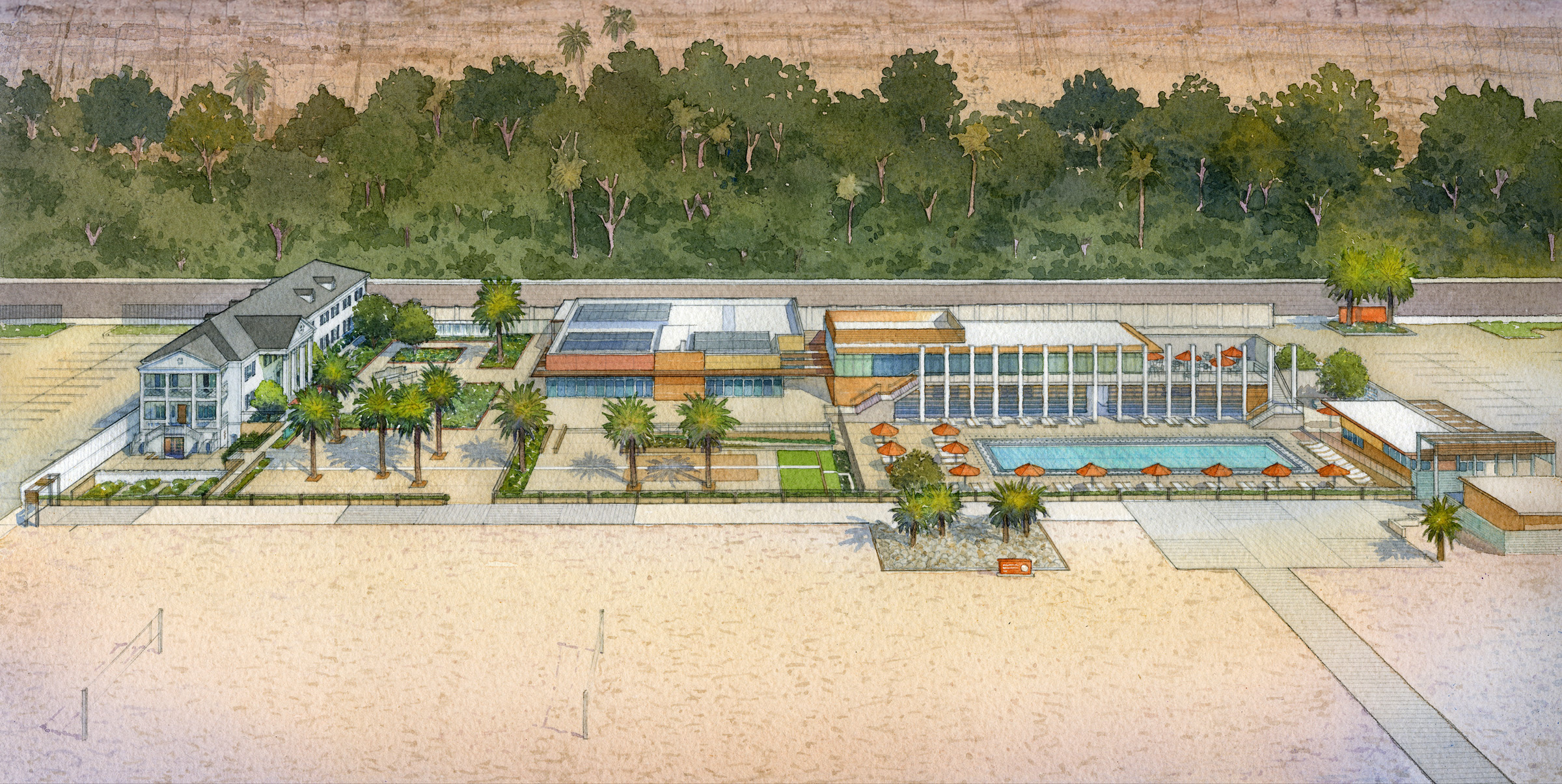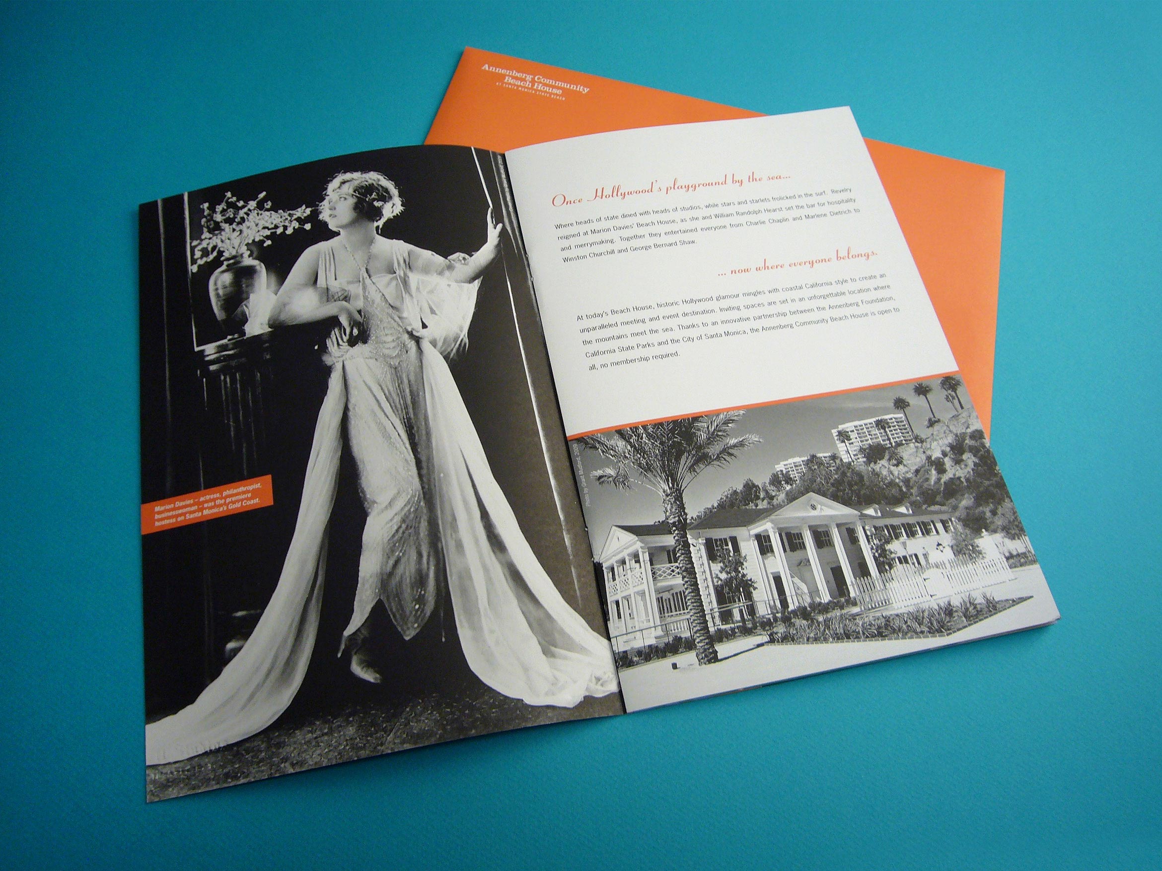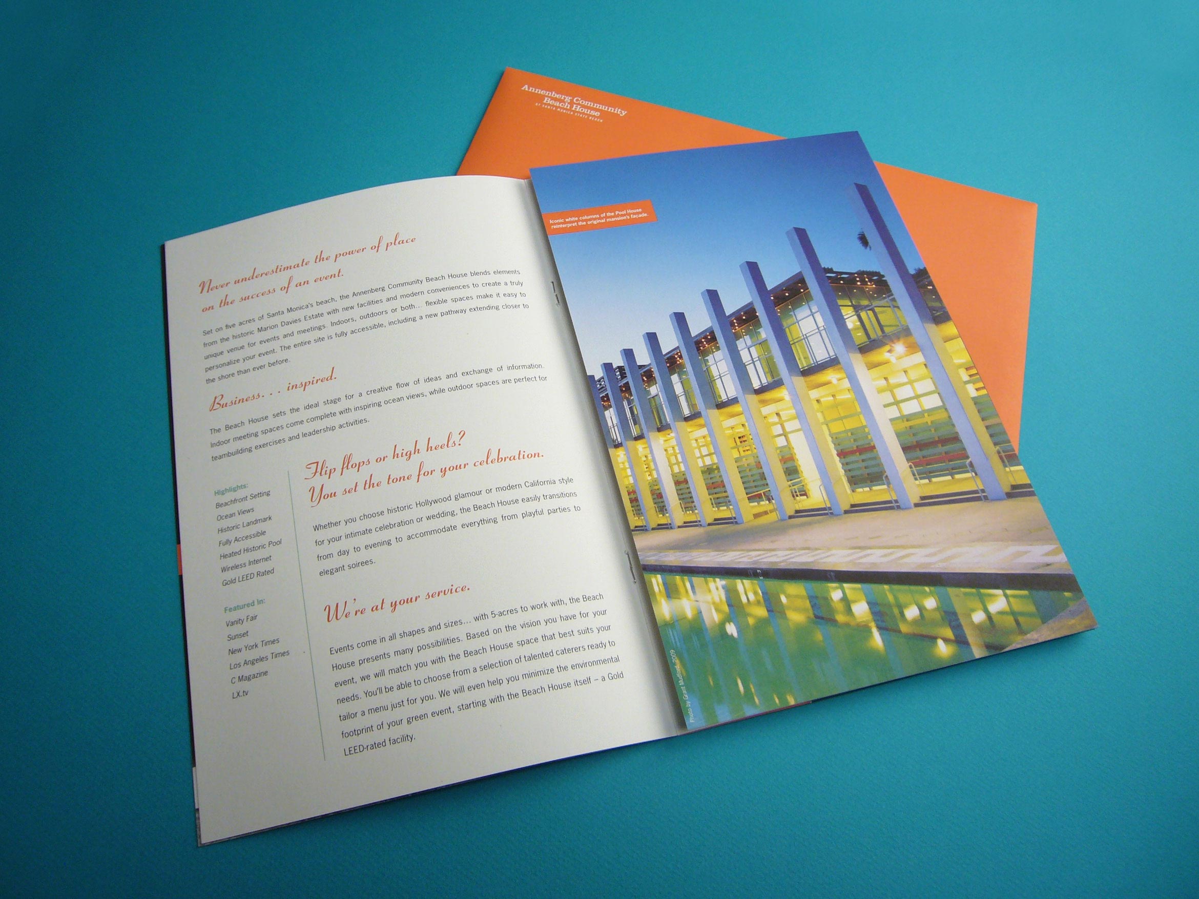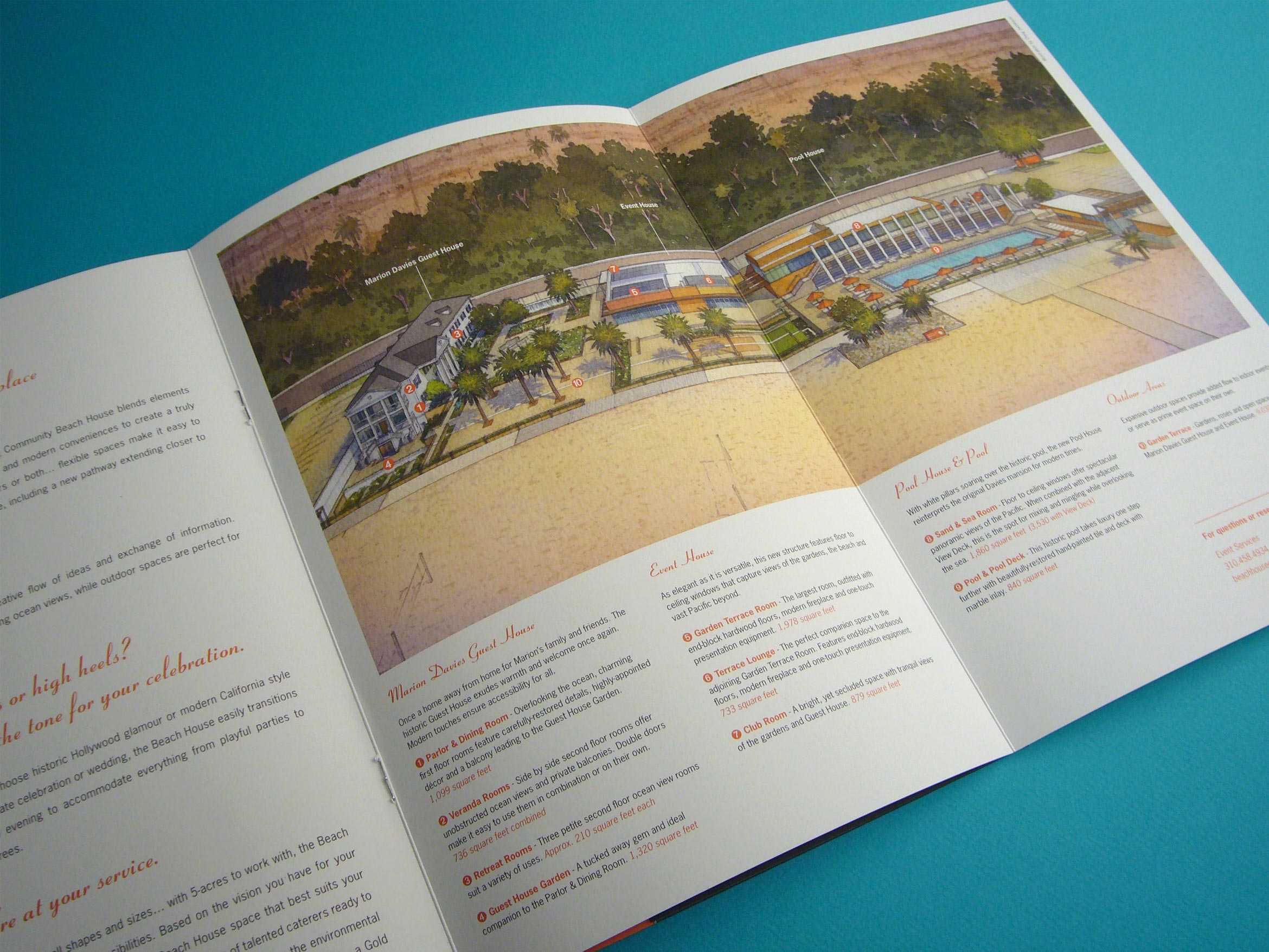 The Annenberg Community Beach House is the former 1930’s estate of actress Marion Davies, purchased for her by William Randolph Hearst, and became notorious for the glamorous parties. Santa Monica revived the estate to be an event space and popular place to hang by the pool. They needed a brochure to promote the various spaces for rent for both social and corporate events.