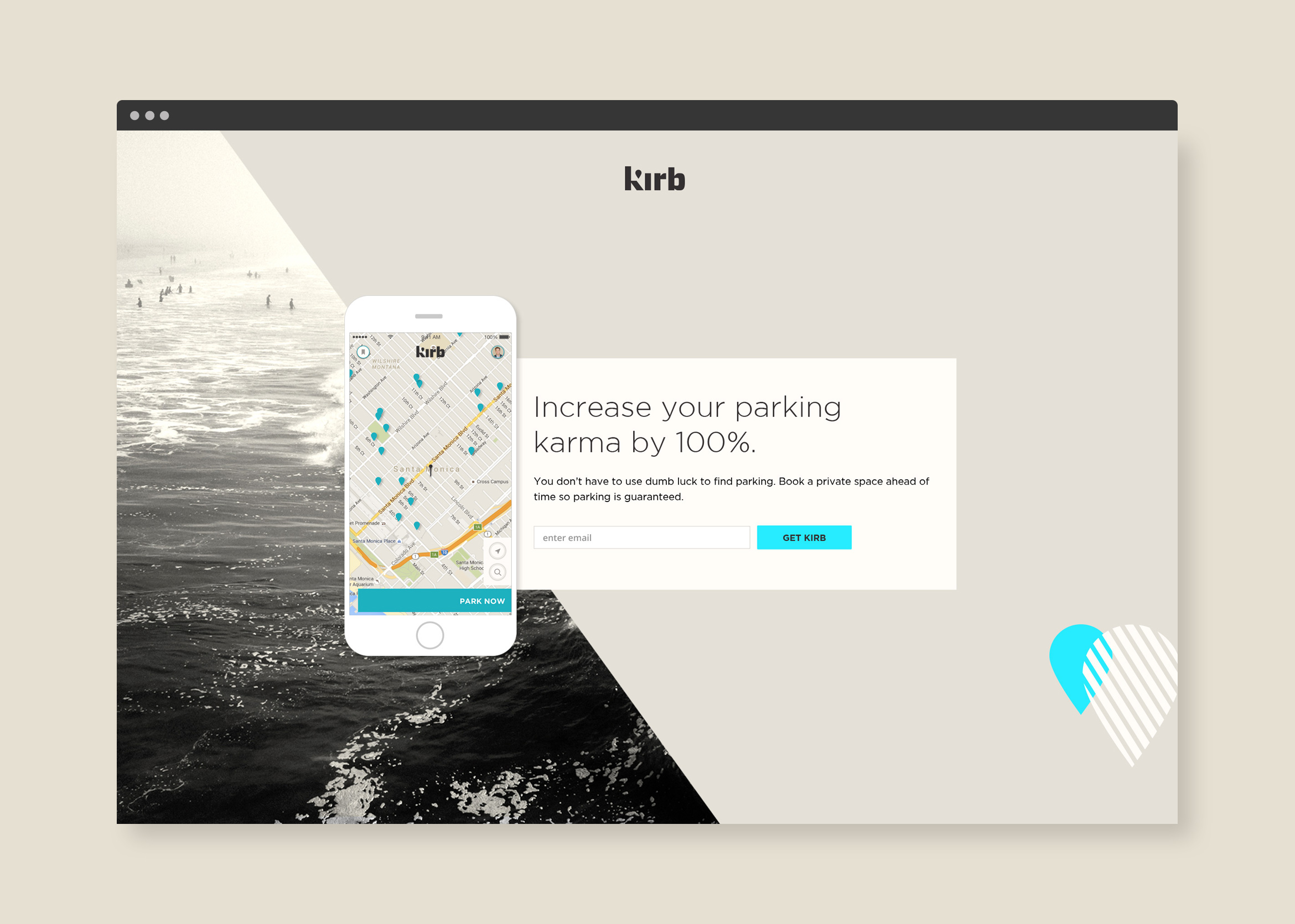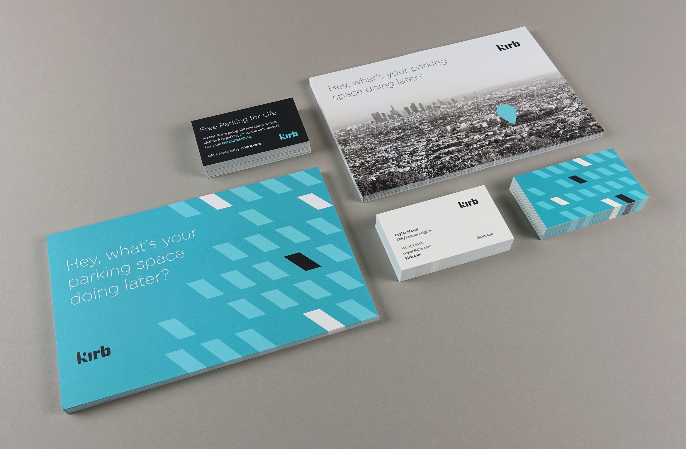 Kirb brings exclusive parking to your favorite LA blocks where you can reserve spaces right from your phone. By refining the “pin” and pulling out the angled “space” from the K, we created a visual system of graphics that stands apart from other parking platforms.