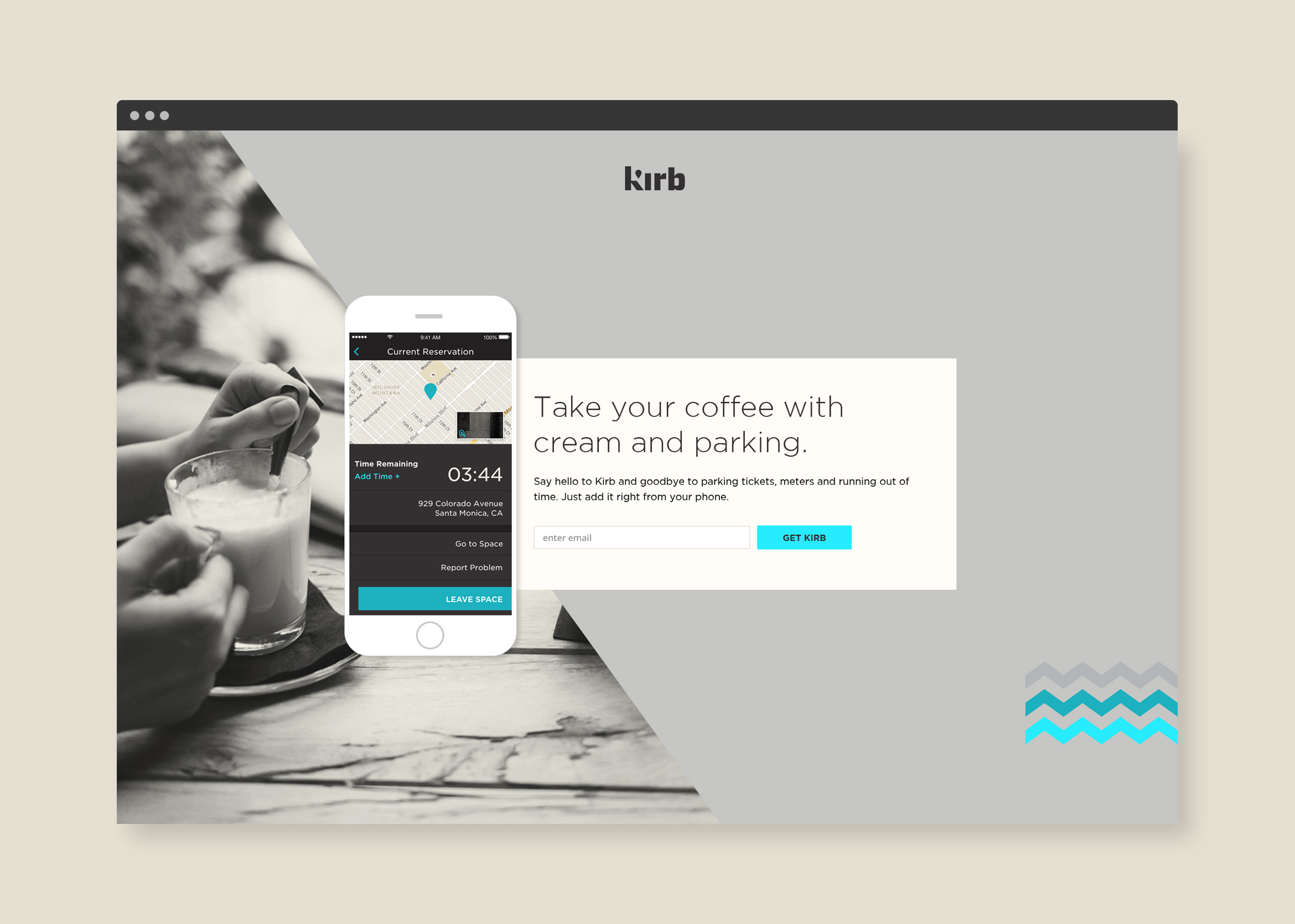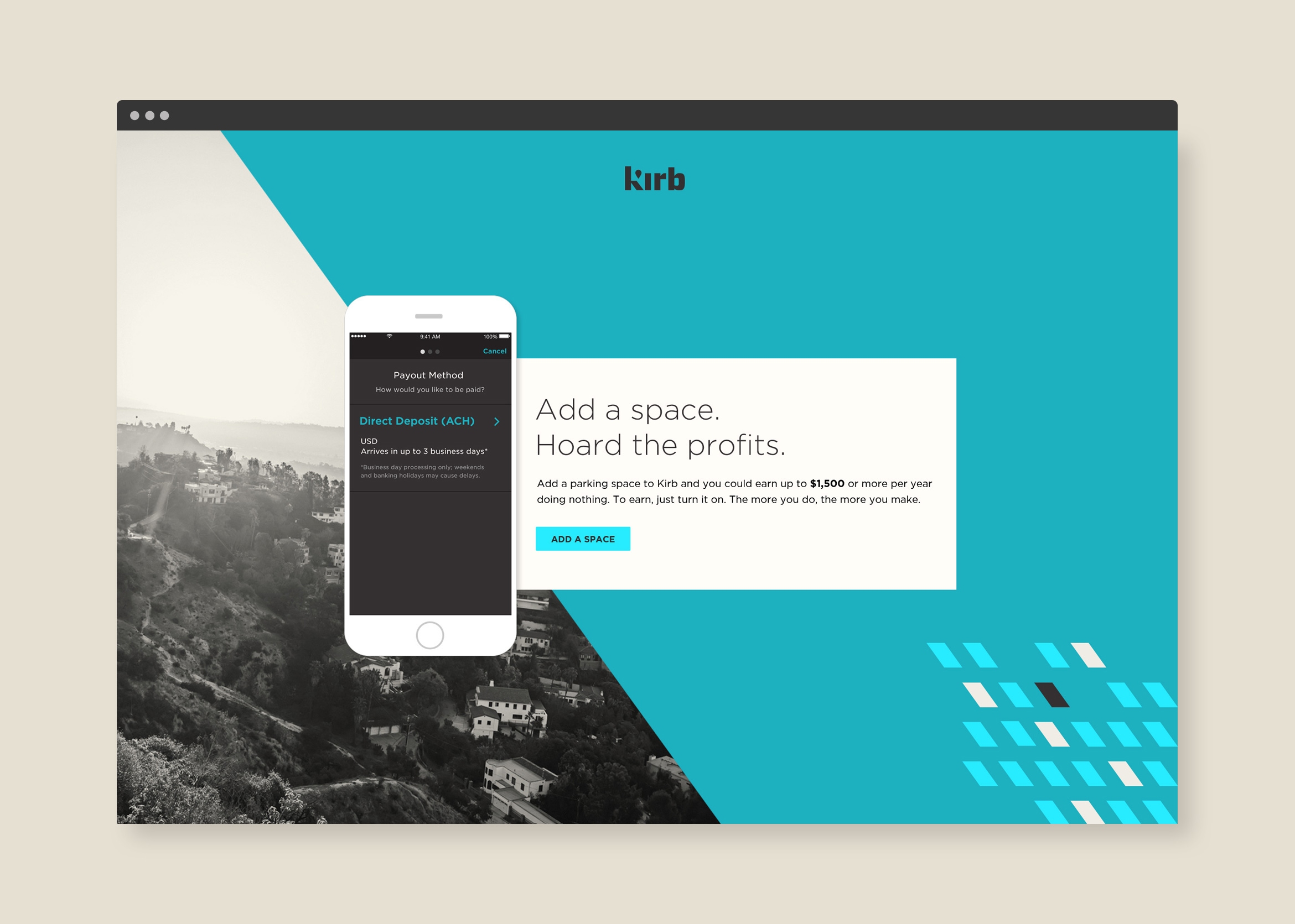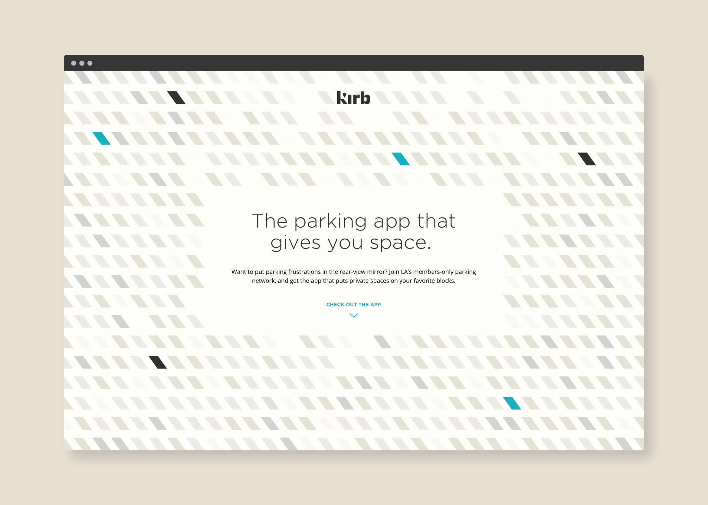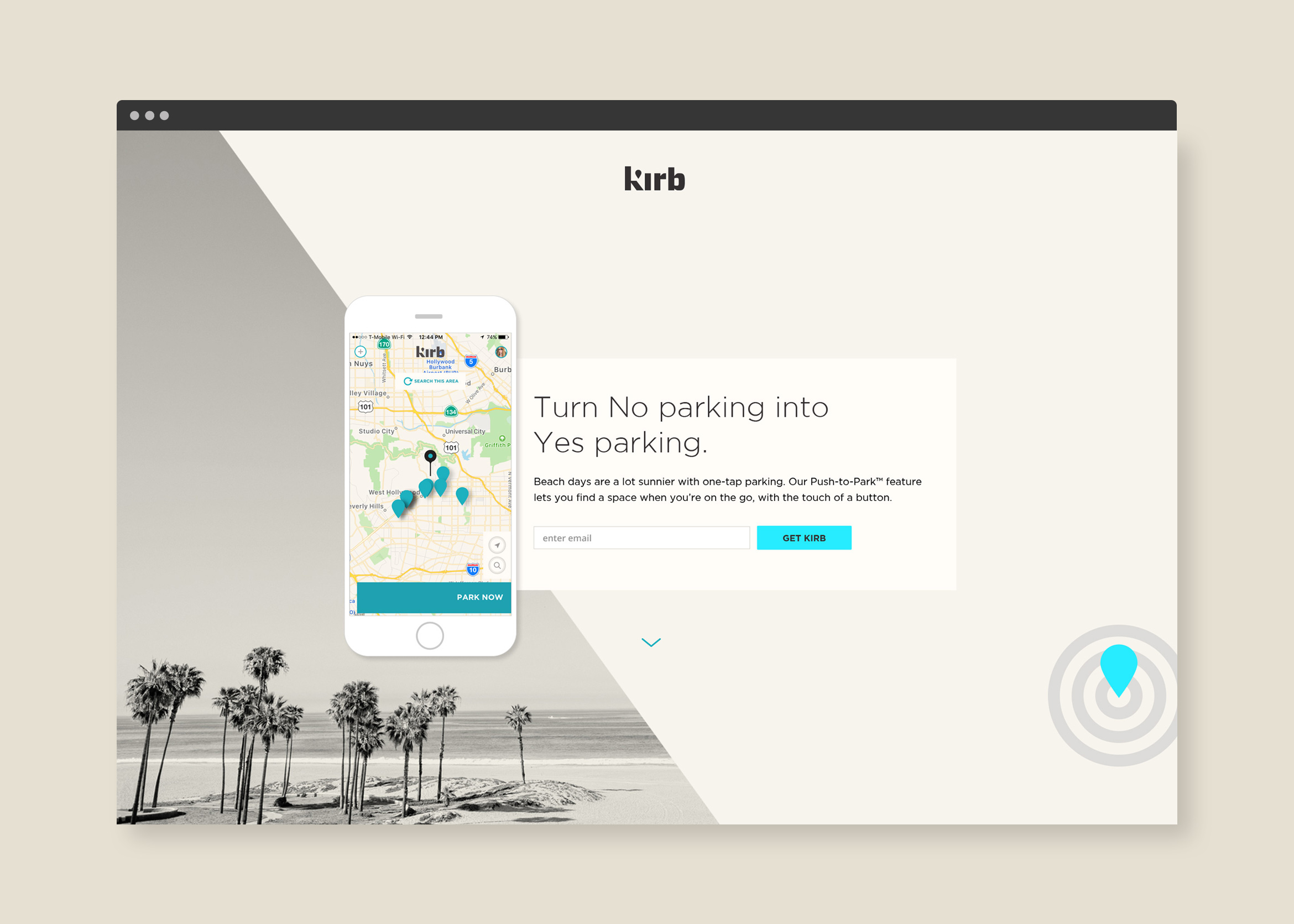 The promotional website uses parallax techniques to showcase the app through a set of 5 screens. Users are invited to get the app or “add a space” to Kirb’s parking network.